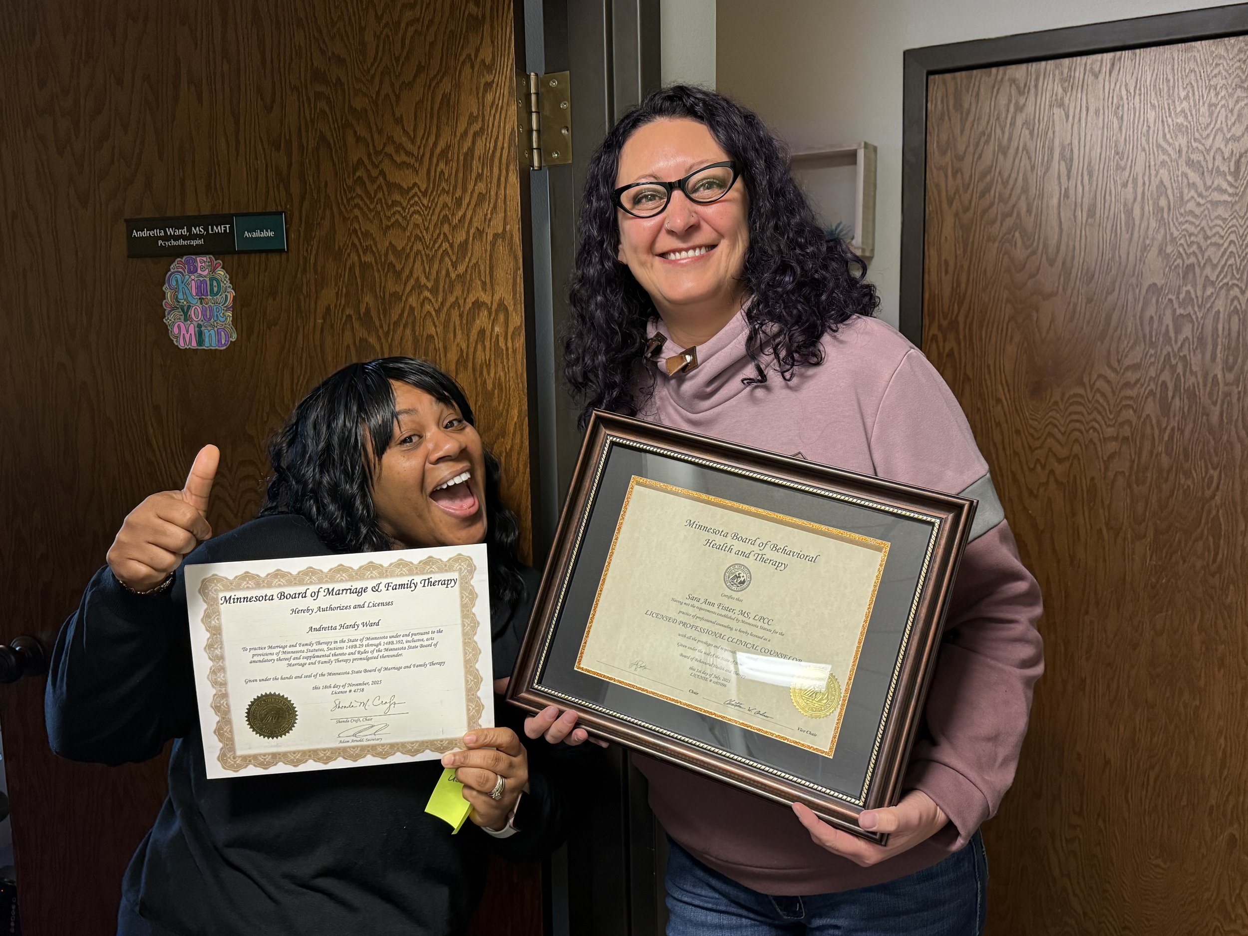It is official! Sara has completed the work to become licensed by the MN BBHT as a Licensed Professional Clinical Counselor! AND… Andretta is now officially a licensed Marriage and Family Therapist by the MN BMFT. We are celebrating with them as they move into their professional status as a licensed provider.